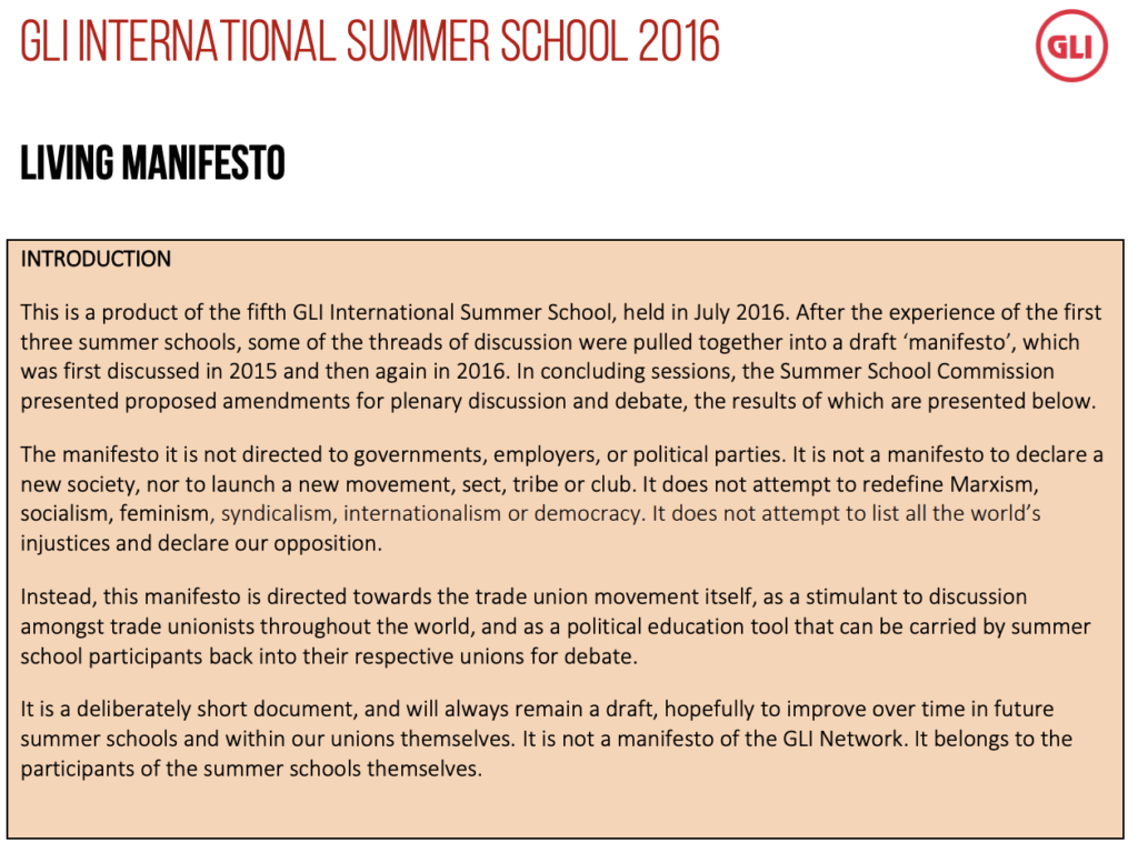 The Living Manifesto is directed towards the trade union movement itself, as a stimulant to discussion amongst trade unionists throughout the world, and as a political education tool that can be carried by summer school participants back into their respective unions for debate.